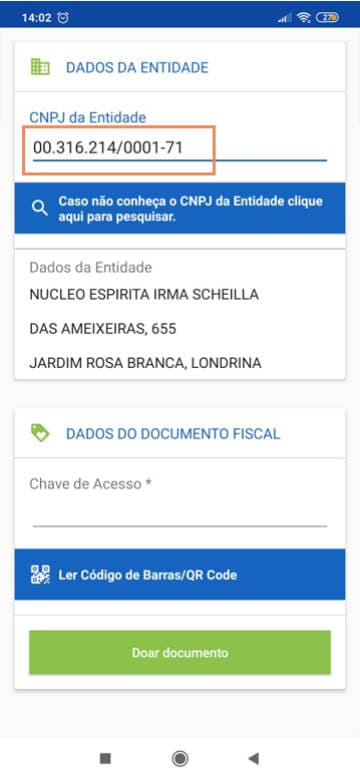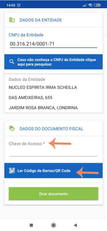 5º Passo – Forneça a chave de acesso encontrada no cupom fiscal. Você pode digitá-la ou fazer a leitura do código presente no cupom. Depois é só escolher a opção “Doar Documento” e sua doação será contabilizada.