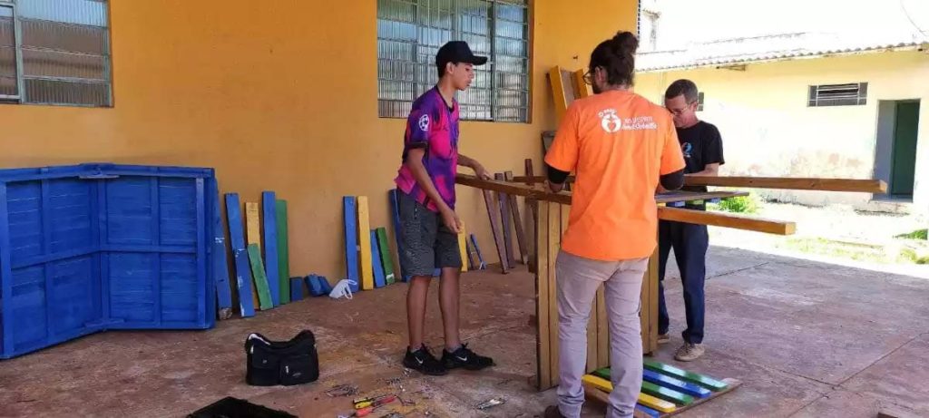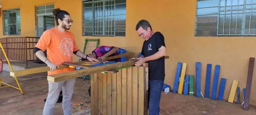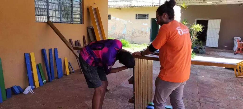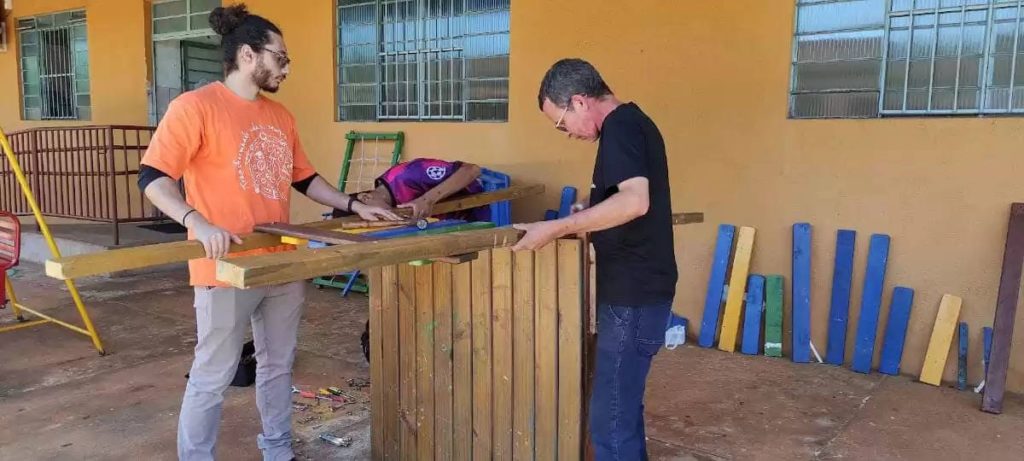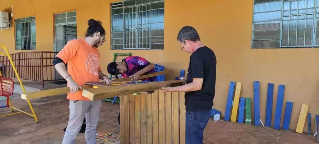 Em mutirão os trabalhadores e voluntários do Núcleo Espírita Irmã Scheilla se organizaram para a montagem e instalação do Parquinho na sede da Instituição.